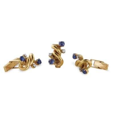 An eighteen karat gold, diamond and sapphire cufflink and tie clip set