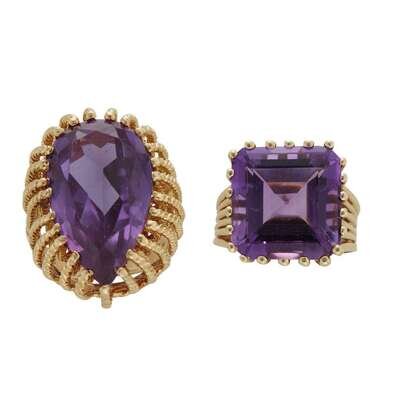 A collection of two amethyst and fourteen karat gold rings