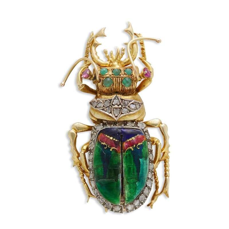 designed as a scarab with green, pink and blue enamel, surrounded by single-cut diamonds with ruby eyes and cabochon emeralds.