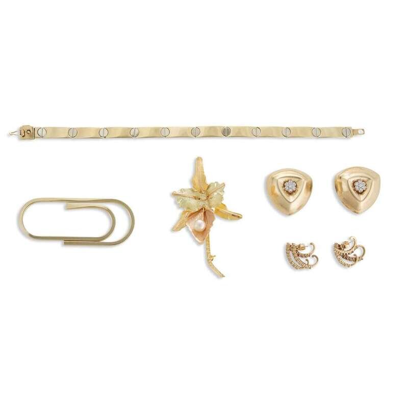 one yellow metal paperclip shaped money clip; one fourteen karat yellow gold link bracelet with screw head motif (7.25"); an eighteen karat yellow gold iris brooch with pearl; pair of fourteen karat and diamond triangular shaped earrings with post and omega back; one pair of fourteen karat three row diamond post earrings- two rows can be detached and worn as a single row.