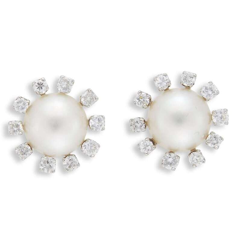 A pair of pearl, diamond and fourteen karat white gold earrings
