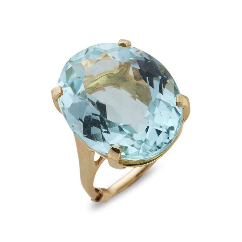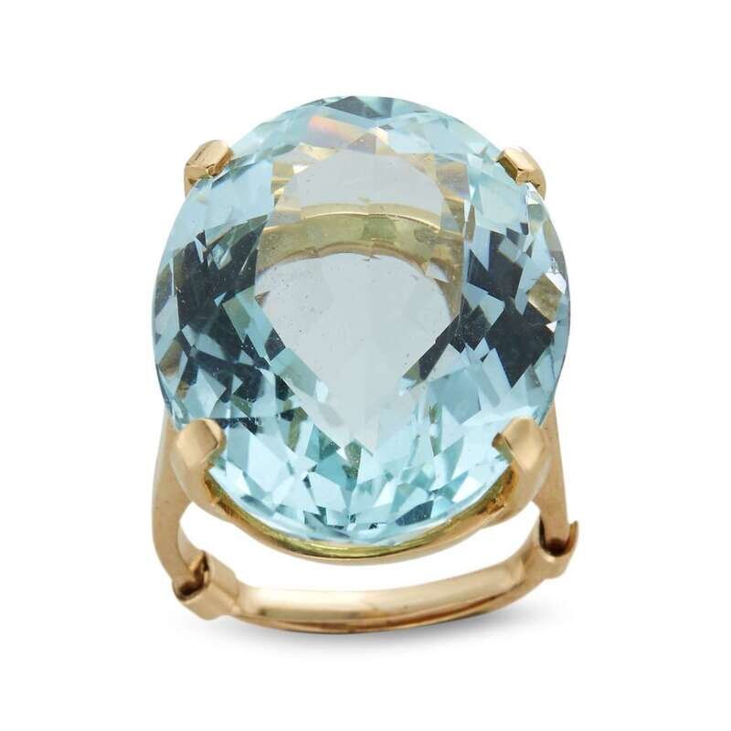 centering an oval-shaped aquamarine measuring approximately 23.30mm x 18.70mm x 11.40mm, mounted in fourteen karat gold.