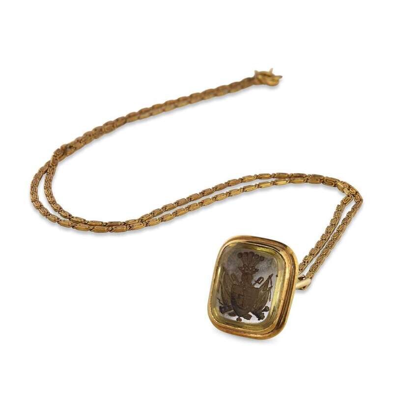 the seal carved in citrine, decorated with gold chasing, suspending from a yellow gold chain.