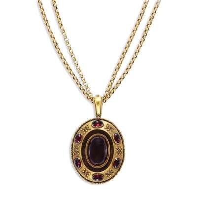 the watch chain with circular links, suspending an oval cabochon garnet pendant accented with smaller garnets and applied bead and wire work.