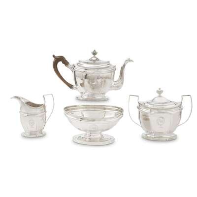 Comprising teapot, creamer, covered sugar bowl, and waste bowl, each piece marked to underside, all with later monograms and engraving.