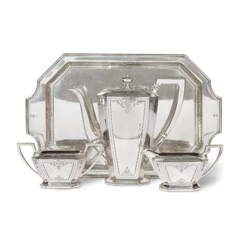 In the 'Colfax' pattern, comprising coffeepot, open sugar, creamer, and tray. (4).