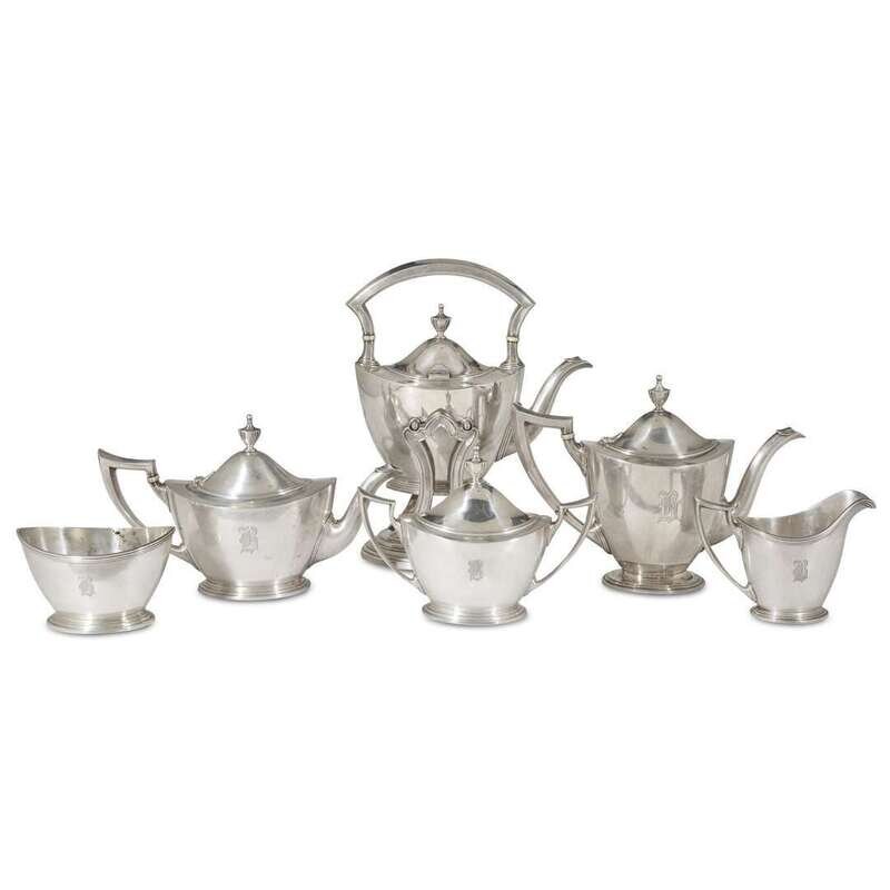 Comprising a tea kettle on stand, coffee pot, teapot, covered sugar, creamer, and waste bowl; each piece inscribed with family crests and monogram "R." (6).