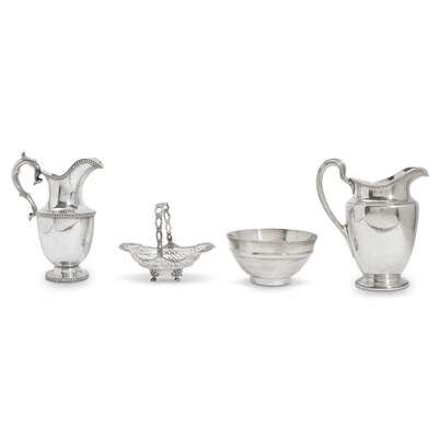 Comprising a sterling silver pitcher, bowl, and sweets basket, all marked Tiffany & Co. to undersides; and a coin silver pitcher, marked Stebbins to underside. (4).
