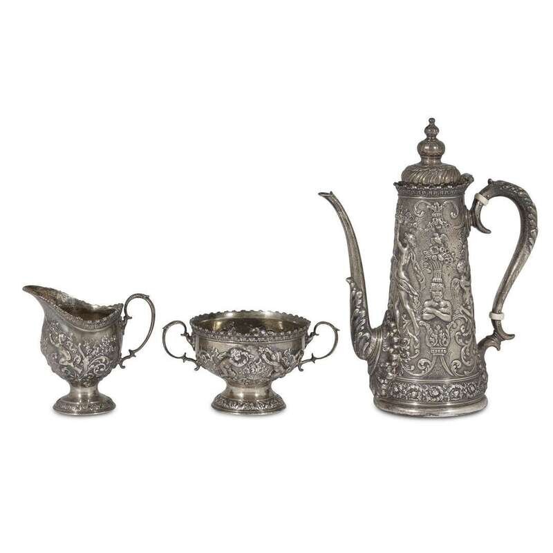 American sterling silver repoussé three-piece coffee service Tiffany & Co., New York, NY, late 19th century