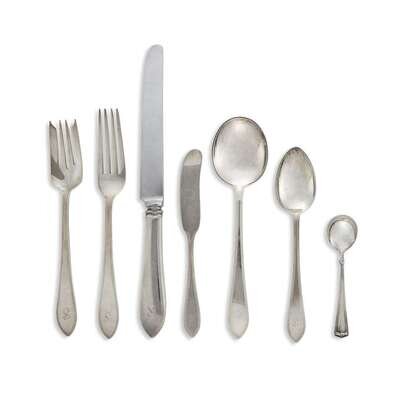 In the 'Reeded Edge' pattern, comprising five each dinner knives, dinner forks, salad forks, table spoons, bouillon spoons butter knives and one salt spoon. (31).
