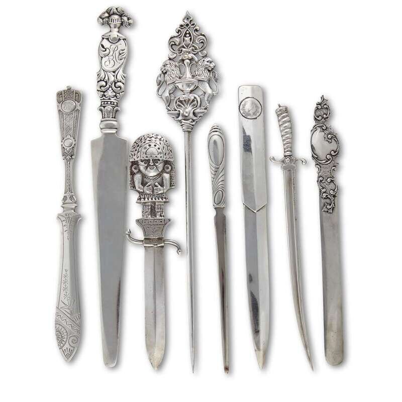 An associated group of seven silver letter openers together with one pick Various makers, various dates