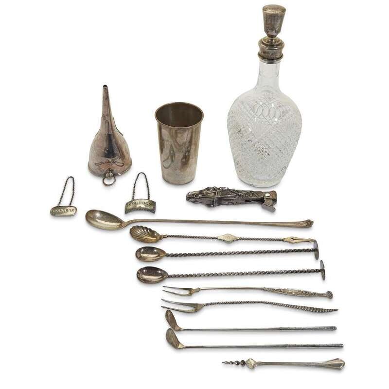The various makers include Tiffany & Co., J.E. Caldwell & Co., Stieff, Wallace, Whiting, and others; comprising a sterling silver mounted crystal liquor decanter, two sterling silver "bourbon" liquor tags, a sterling silver drink cup, six sterling and silverplated swizzle spoons/sticks, three sterling silver cocktail forks, and a silverplated funnel; together with a silverplated horse-form cutter. (15).