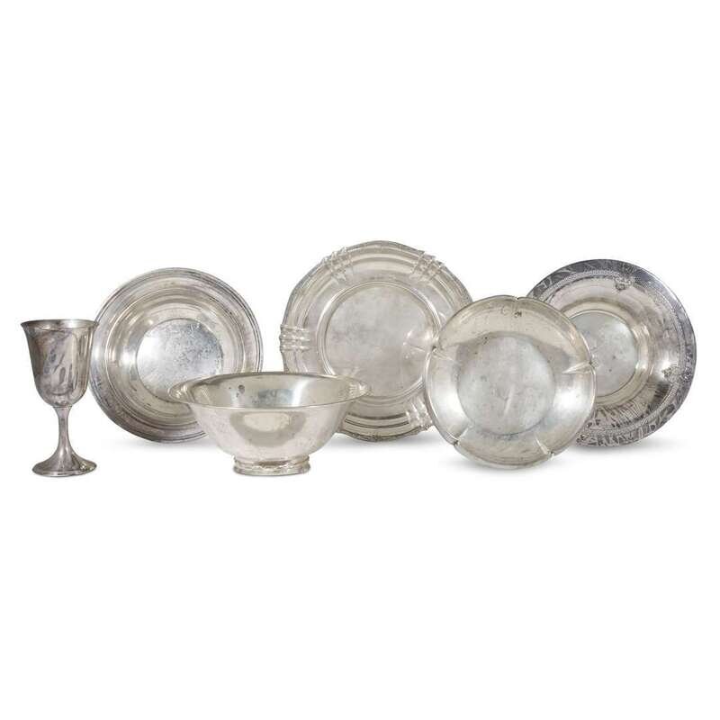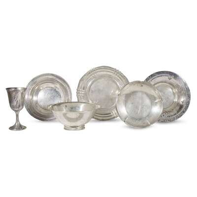 Various makers including J.S. Co., Gorham Mfg. Co., Towle, Wallace, and others; comprising three bowls, one footed bowl, one dish, and goblet; the goblet inscribed, "Elizabeth Lloyd Cup/Best All Around Girl/Jokake School/1940/Joan Augusta Burgess." (6).