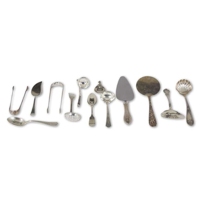 Comprising a Stieff sterling tomato server, a Towle sterling tomato server, two small English sterling ladles, two English sterling sugar tongs, a coin silver ladle by J.E. Caldwell & Co., a cake knife (unmarked), and five sterling and coin silver spoons and scoops by other various makers, marked to undersides. (13).