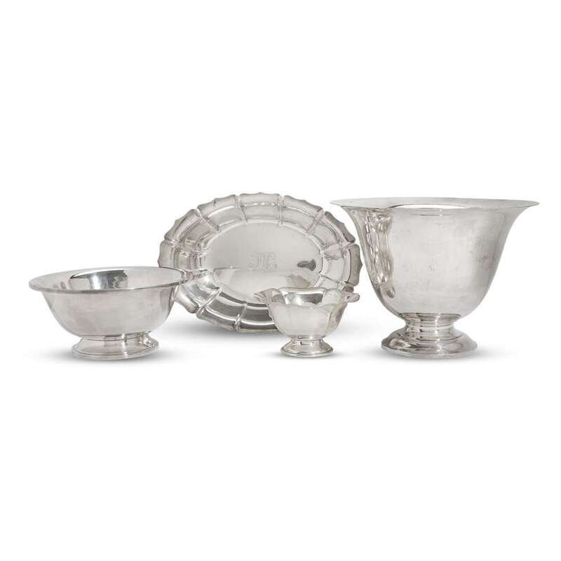 Comprising a footed punch bowl, a Revere style footed bowl, a monogrammed oblong roll tray, and footed candy dish. (4).