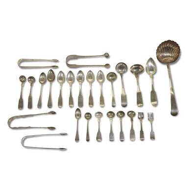 Comprising seventeen coin silver spoons/ladles, five sterling silver spoons, two sterling silver sugar tongs, and two coin silver sugar tongs. (26).