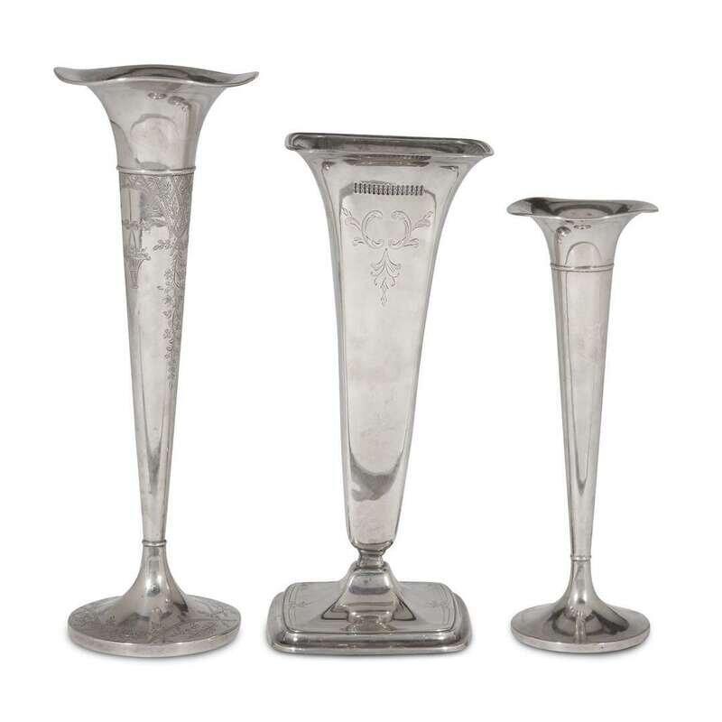 Three American sterling silver chased and engraved trumpet vases Various makers, 20th century