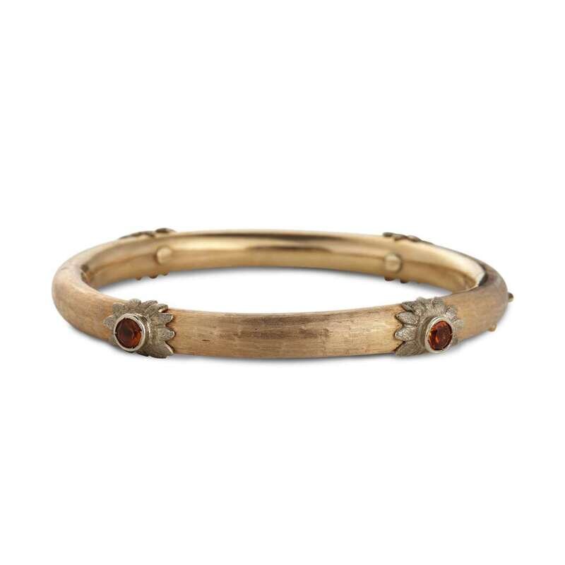 hinged design set with faceted quartz accents, textured finish.