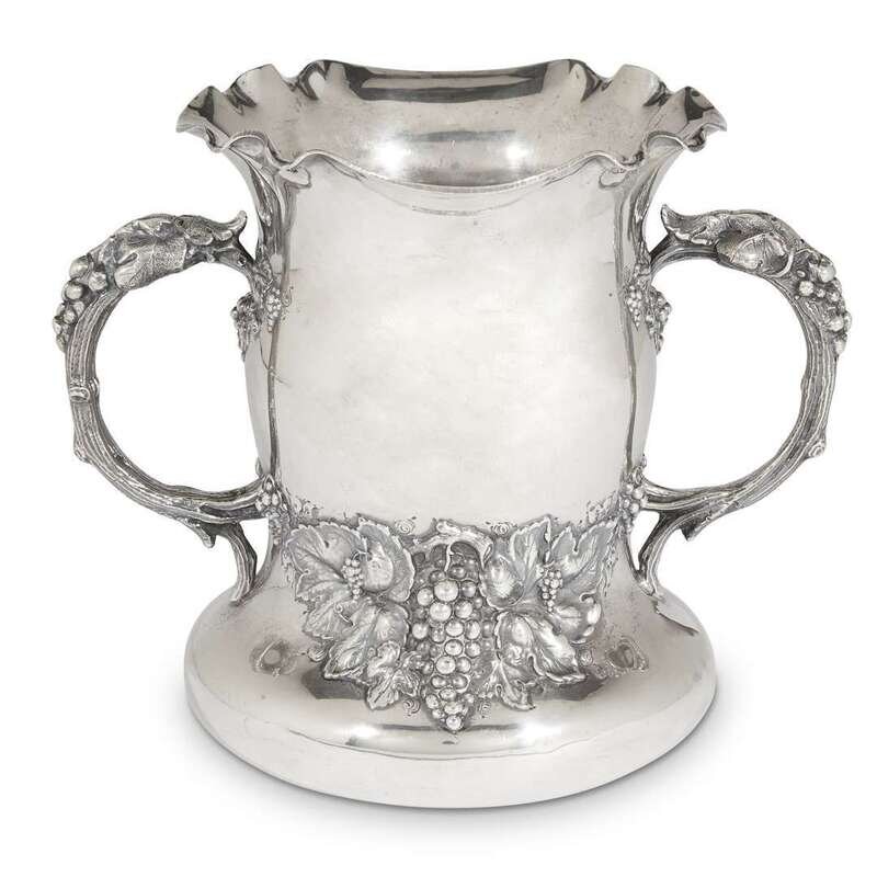 With repoussé and cast grape motifs to body and handles, marked to underside.