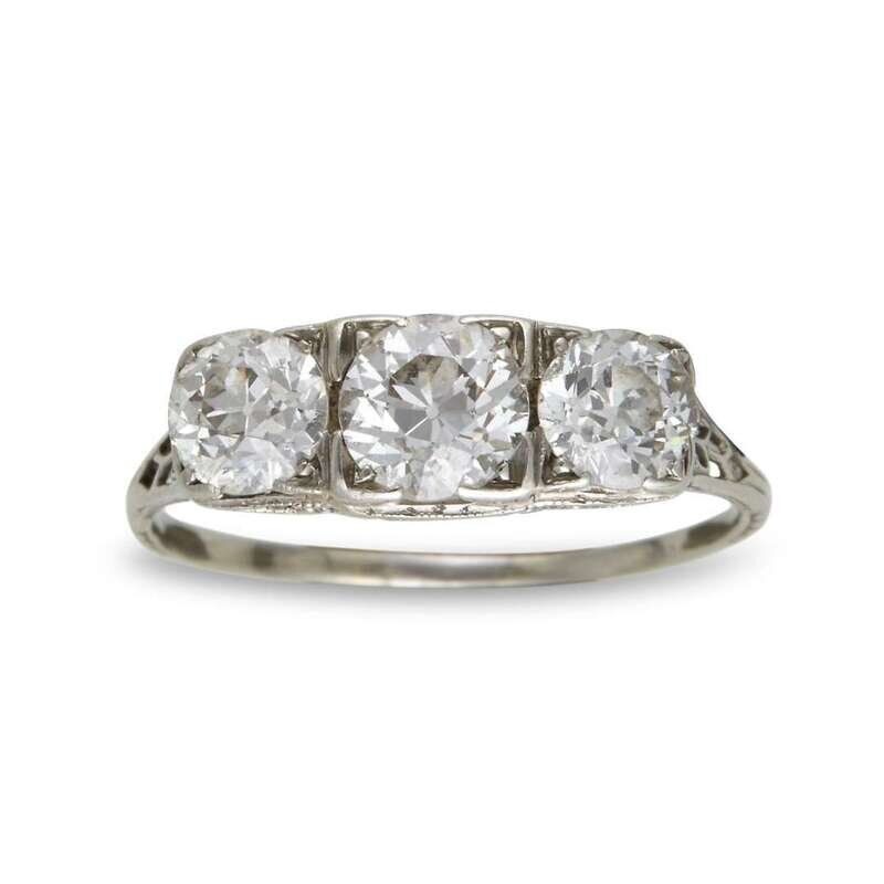 set across the top with old-cut diamonds; estimated total diamond weight: 1.00 carat, within a pierced eighteen karat white gold mount.