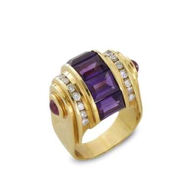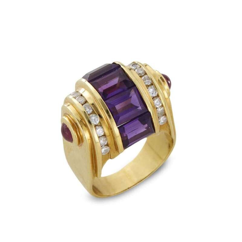 centered by five emerald-cut amethysts vertically set as a dome, flanked by round brilliant-cut diamonds on the shoulders and cabochon rubies, mounted in eighteen karat gold.