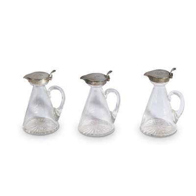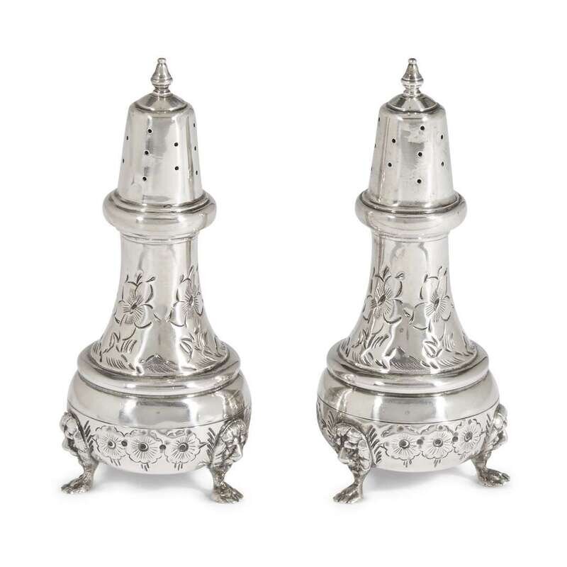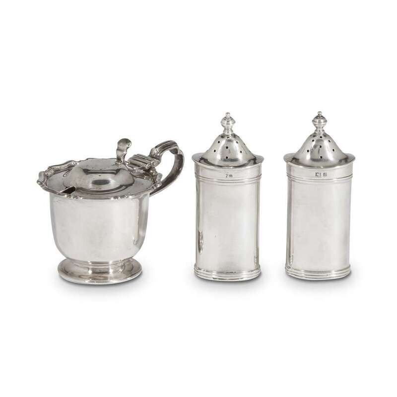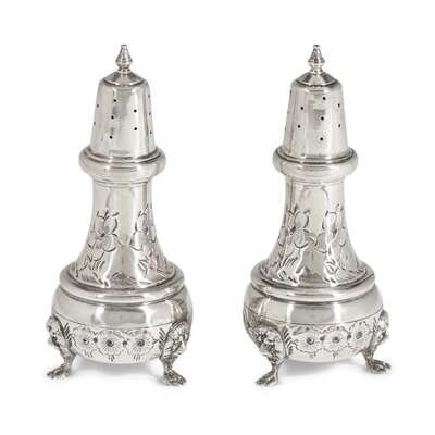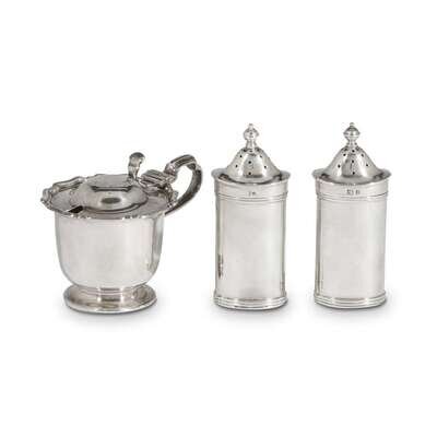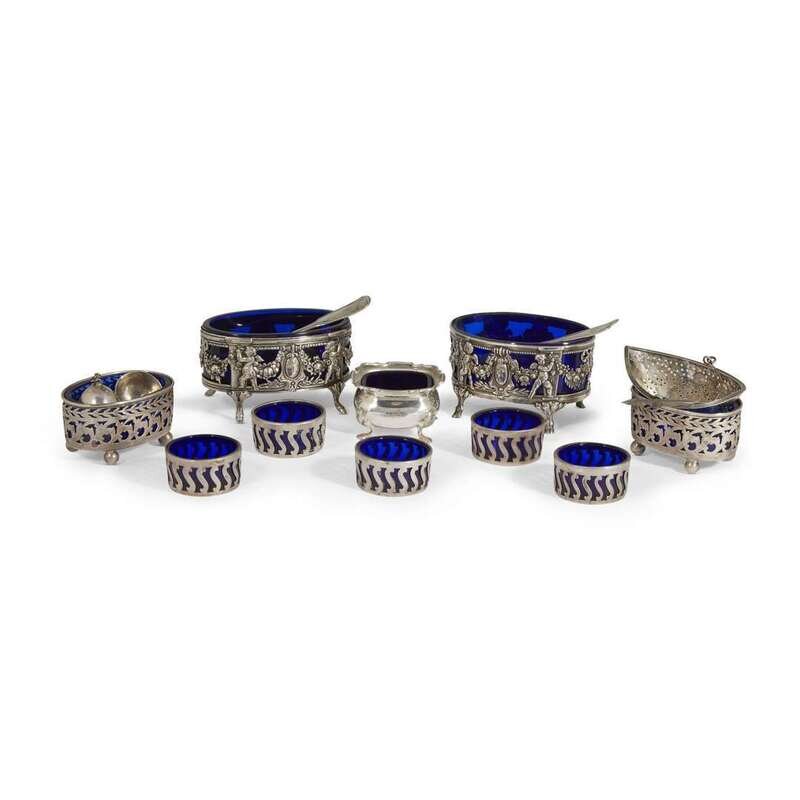 h century Comprising two pairs of sterling silver casters, ten cobalt glass-lined sterling and .800 silver salts, a sterling silver mustard pot, and three sterling mounted glass cruets; together with two coin silver salt spoons, a silver tea diffuser, and a silver pommander. (22).