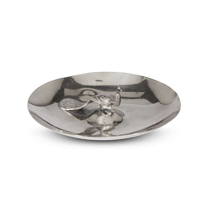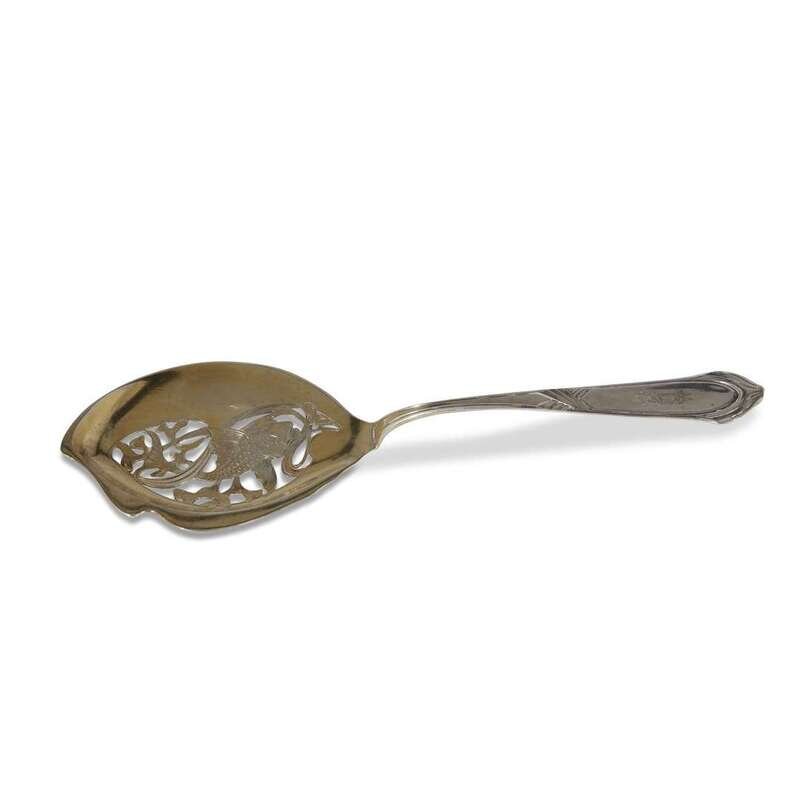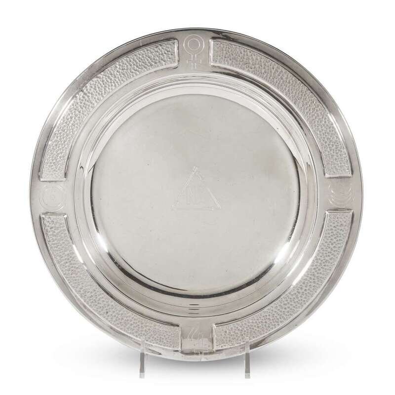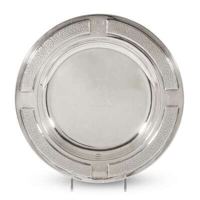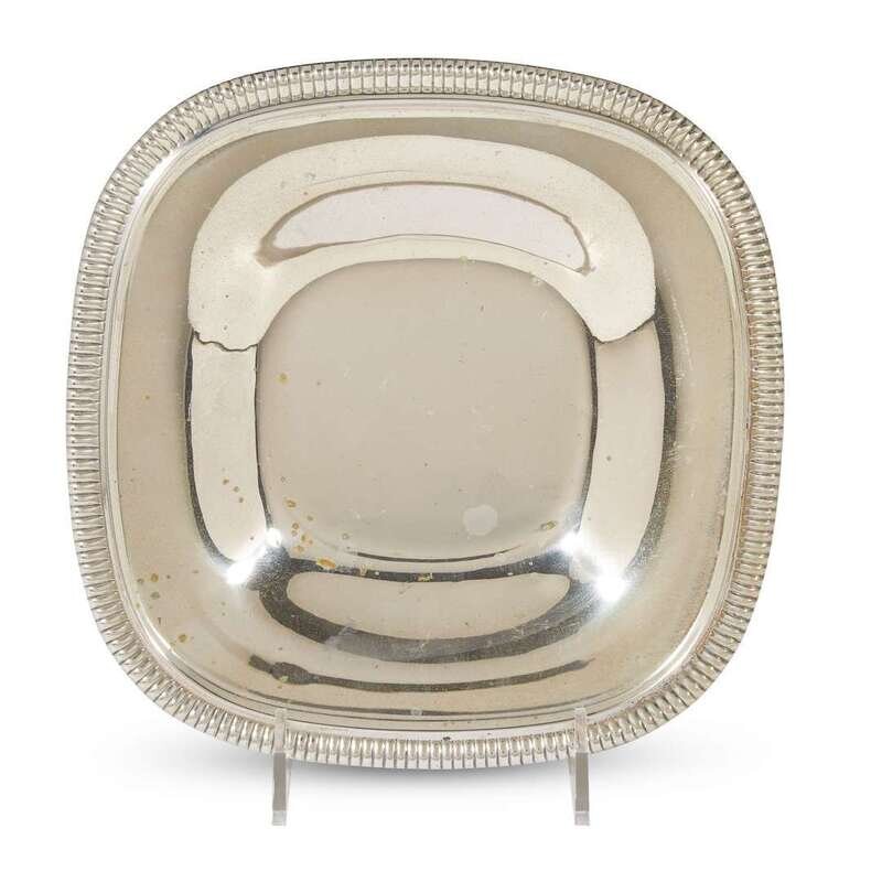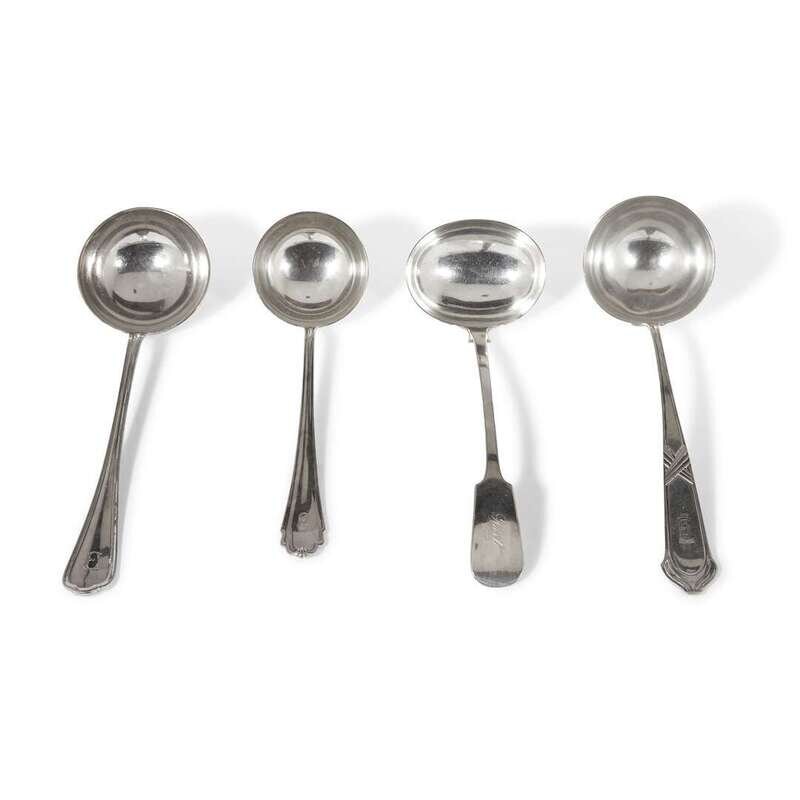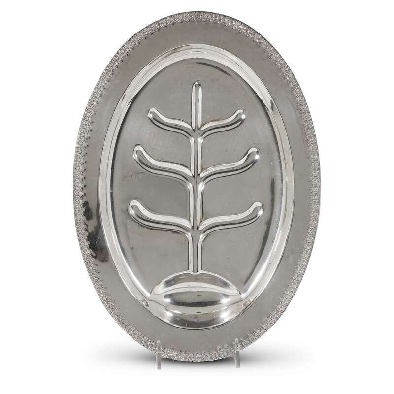 Comprising a .800 silver ladle and fish server, both marked Lazarus Posen, Berlin and Frankfurt, Germany, with monograms "RHE"; a Christofle silver ladle with monogram "E"; two silverplated ladles with monograms "E" and "Hart"; an International Silver sterling bowl with cast floral edge; a Reed & Barton sterling silver nut dish with peacock finial; a German sterling silver presentation plate with "NA" logo and various symbols to rim; and four silverplated platters/dishes. (12).