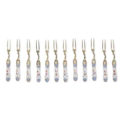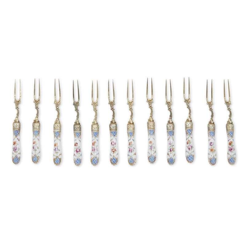 A set of twelve Continental silver-gilt olive forks with Meissen-style porcelain handles Late 19th/early 20th century