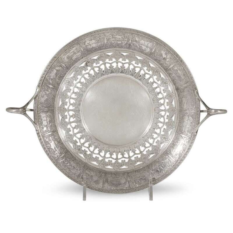 The rim decorated with cast and chased bucolic scenes, the well reticulated, with two handles.