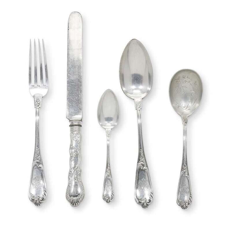 Comprising twelve each: dinner forks, tablespoons, teaspoons, and sterling-handled knives; and a sauce spoon. (approx. 25 pcs).