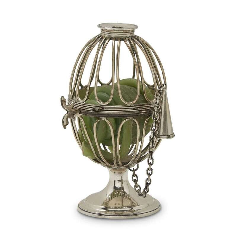 Egg-shaped and of cage form on a stepped circular base with snuffer and key, marked on base, lid, and snuffer.
