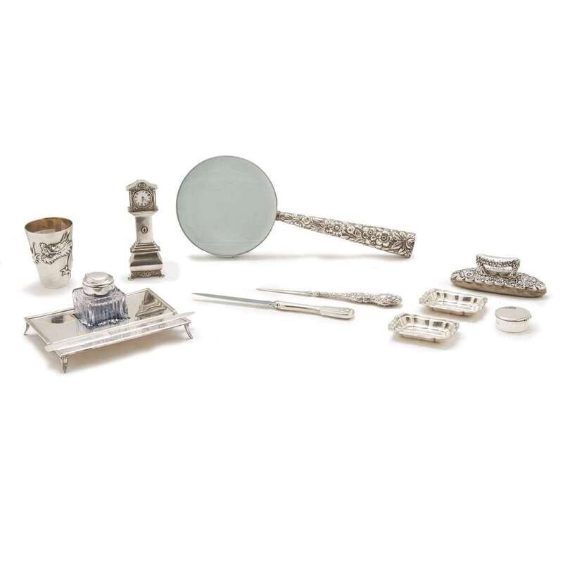 The various makers including Tiffany & Co., Reed & Barton, and others; comprising an English sterling silver desk set, marked S.P. & Co., Birmingham (inkwell and penholder); three letter openers (one marked Tiffany & Co.); a silver-mounted magnifying glass; an ink blotter, marked Tiffany & Co.; a compact, marked Tiffany & Co., two small trays, marked Reed & Barton; A Dutch silver miniature grandfather clock, with associated hallmarks; and a Chinese silver cup with dragon motif. (12).