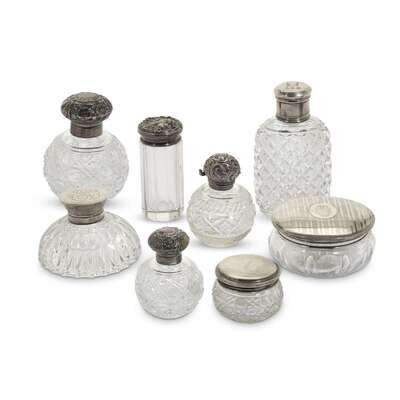 h century. Comprising eight sterling, silver, and silverplate mounted crystal scent bottles and dressing jars, and other various sterling snd silver mounted dressing items: two whisk brooms, two brushes, four nail files, four dressing hooks, two shoe horns, a comb, and a mirror. (24).