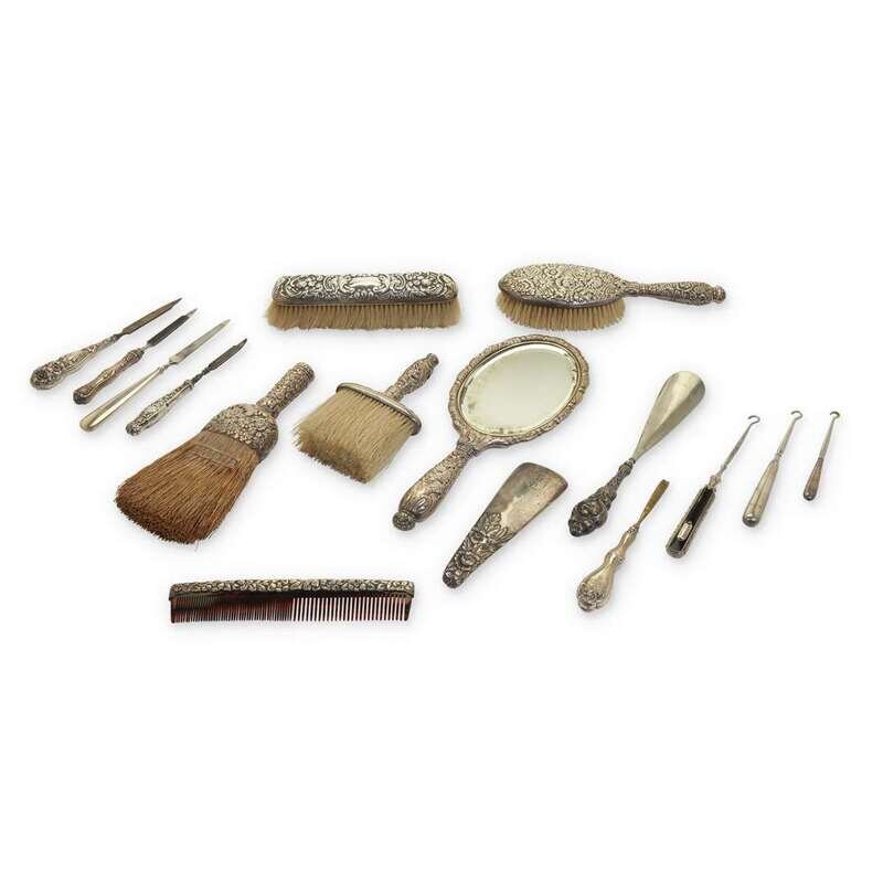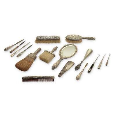 An assembled collection of twenty-four sterling, silver, and silverplate mounted dressing items Various English, Continental, and American makers, late 19th/early 20t