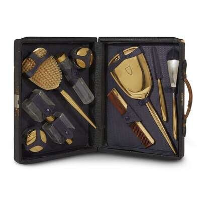 The first comprising hand mirror, comb, file, shoe horn, two compact jars, three perfume bottles, and brush; the second comprising hand mirror, comb, brush, shoe brush, two compact jars, and three perfume bottles. (2).