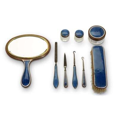 Comprising three dressing jars, two nail files, two dressing hooks, a brush, and a hand mirror. (9).