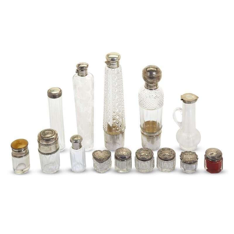 A collection of fourteen sterling and silver mounted crystal and cut glass scent/dressing bottles and jars Various makers, late 19th/early 20th century