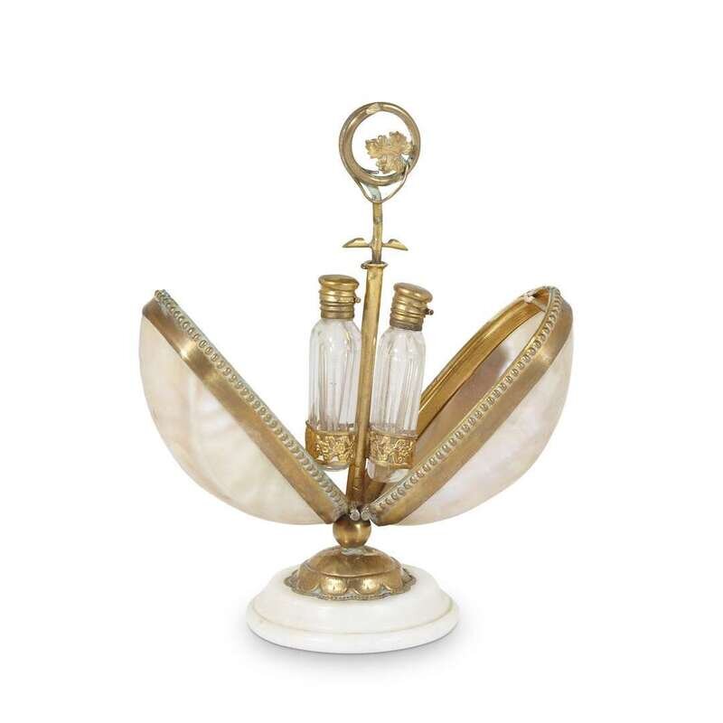 On marble stand, containing two vinaigrette bottles.