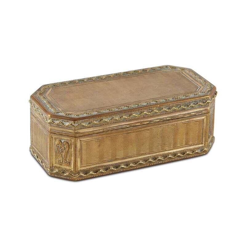 Rectangular, the engine turned tops and sides bordered within reeded and modeled framework.