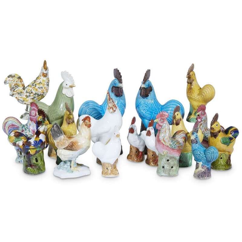 An assembled collection of eighteen ceramic rooster figurines 19th-20th century