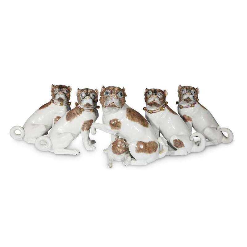 A group of five Dresden porcelain pugs Potschappel Dresden, Germany, 20th century