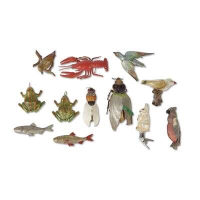 Comprising blown glass and early plastic examples, including birds, insects, fish, frogs, rabbits, camels, kangaroos, lobster, dog, cat, cow, elephant, and giraffe. (approx. 36 pcs).