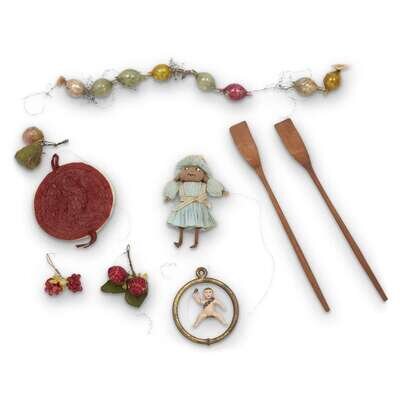 Comprising blown glass, metal, paper, fabric, early plastic, and wax examples in various forms: nursery toys, baskets, flowers, fruits, hats, paddles, hearts, crane, saddle, cradles, carriages, bottle, book, shoes, lantern, watering can, horse and rider, etc.