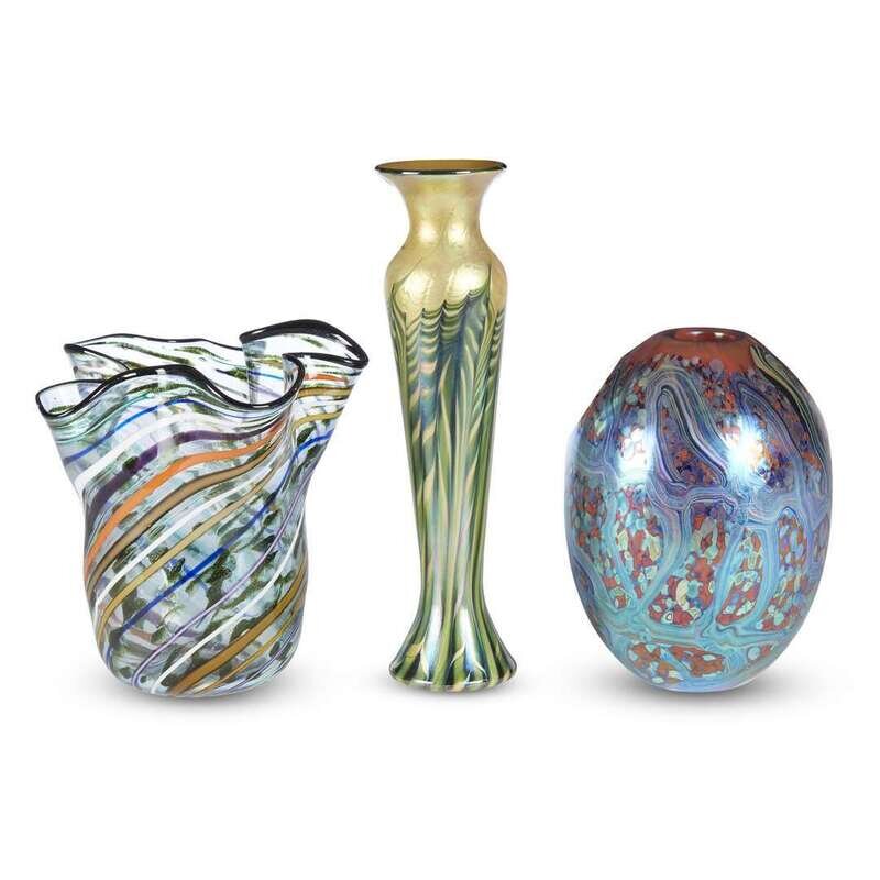 The tallest vase etch-signed "Juniper Studios 2007/100307" to underside, the oval vase etch-signed "Eichelt(?) Vuicr 2010" to underside, the third vase apparently unsigned. (3).