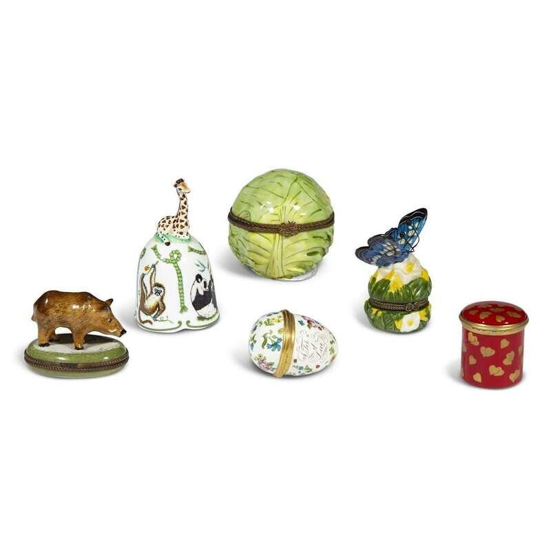 Comprising two Limoges hinged porcelain boxes: a boar and a head of lettuce; two Halcyon Days hinged enameled metal boxes: a red box with gold hearts and an egg-form box with florals and the phrase "A Token of Love"; an unmarked hinged porcelain box in the form of a butterfly atop a bunch of calla lilles; and a small Lynn Chase Designs porcelain bell with various animals and a giraffe-form handle. (6).