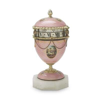 A pink guilloché enamel vasiform table clock 20th century