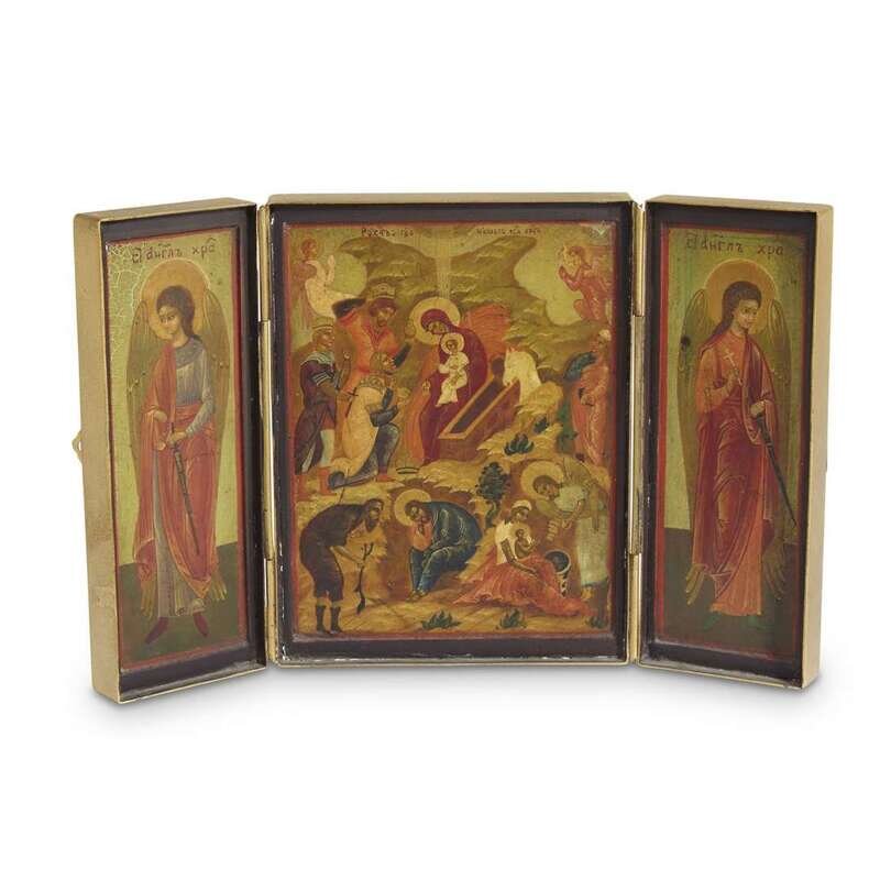 The icon opens to reveal a triptych: the central panel illustrates the Nativity, flanked by angels on either side panel.