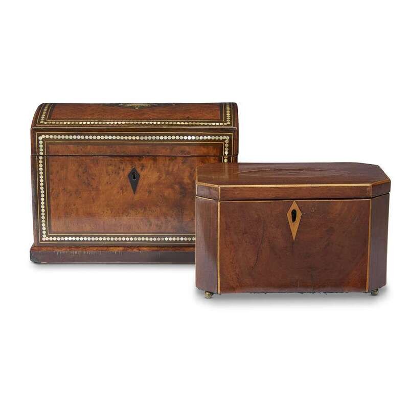Both with lift lids, the tallest burl walnut box having mother-of-pearl and mahogany inlays; the smaller walnut box being a string-inlaid tea caddy, with canted corners and twin compartment.