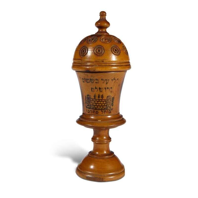 A vasiform-turned body with conical lid, inscribed in Hebrew with a scene of Solomon's Temple.