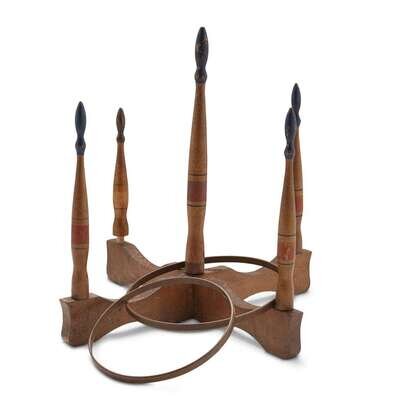Comprising a two-board stand with five target poles, together with two wood rings. (9).